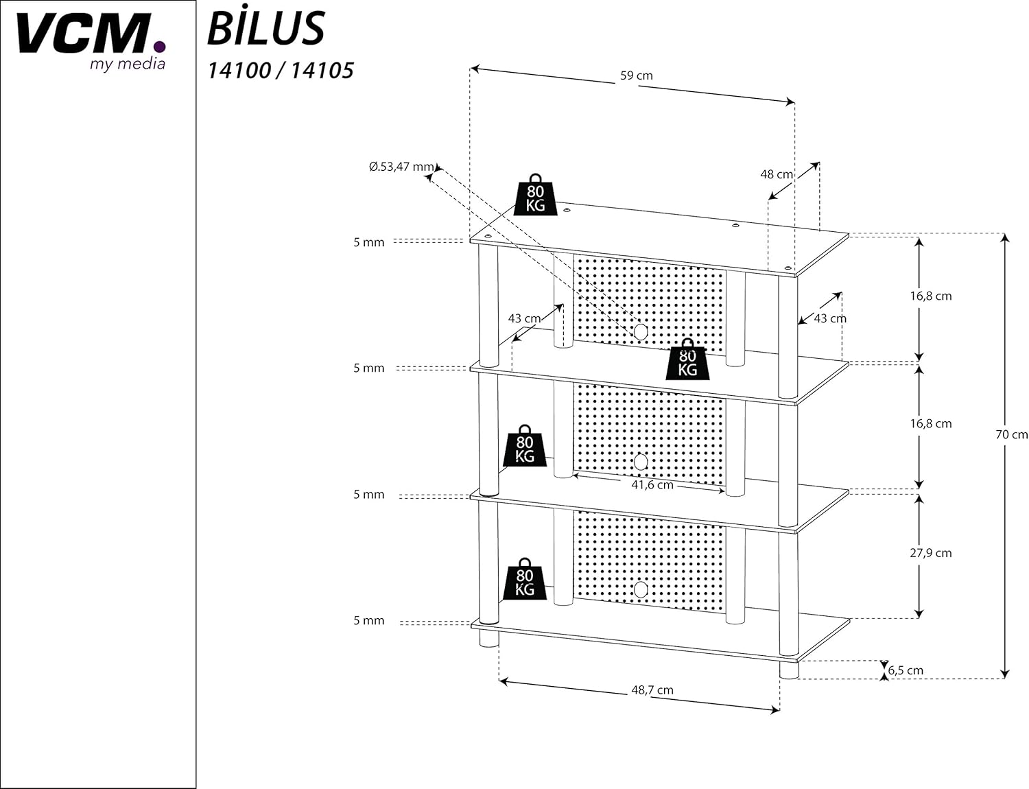 Meuble Hifi "Bilus" avec 4 étagères en verre clair. Conduit pour dissimuler les câbles, 4 étagères en 6mm verre de sécurité ESG, colonne en Aluminium. Tous les 4 étagères en verre sont chacun une capacité jusqu'à 80 kg de charge. Les distances commerciaux sont chacun 17 cm pour les deux compartiments supérieur et 28 cm dans le compartiment inférieur. Le produit est livré démonté avec sa notice de montage. Dimensions: Hauteur 70 x Largeur 54 x Profondeur 45 cm. Couleur: Argent / Verre Clair