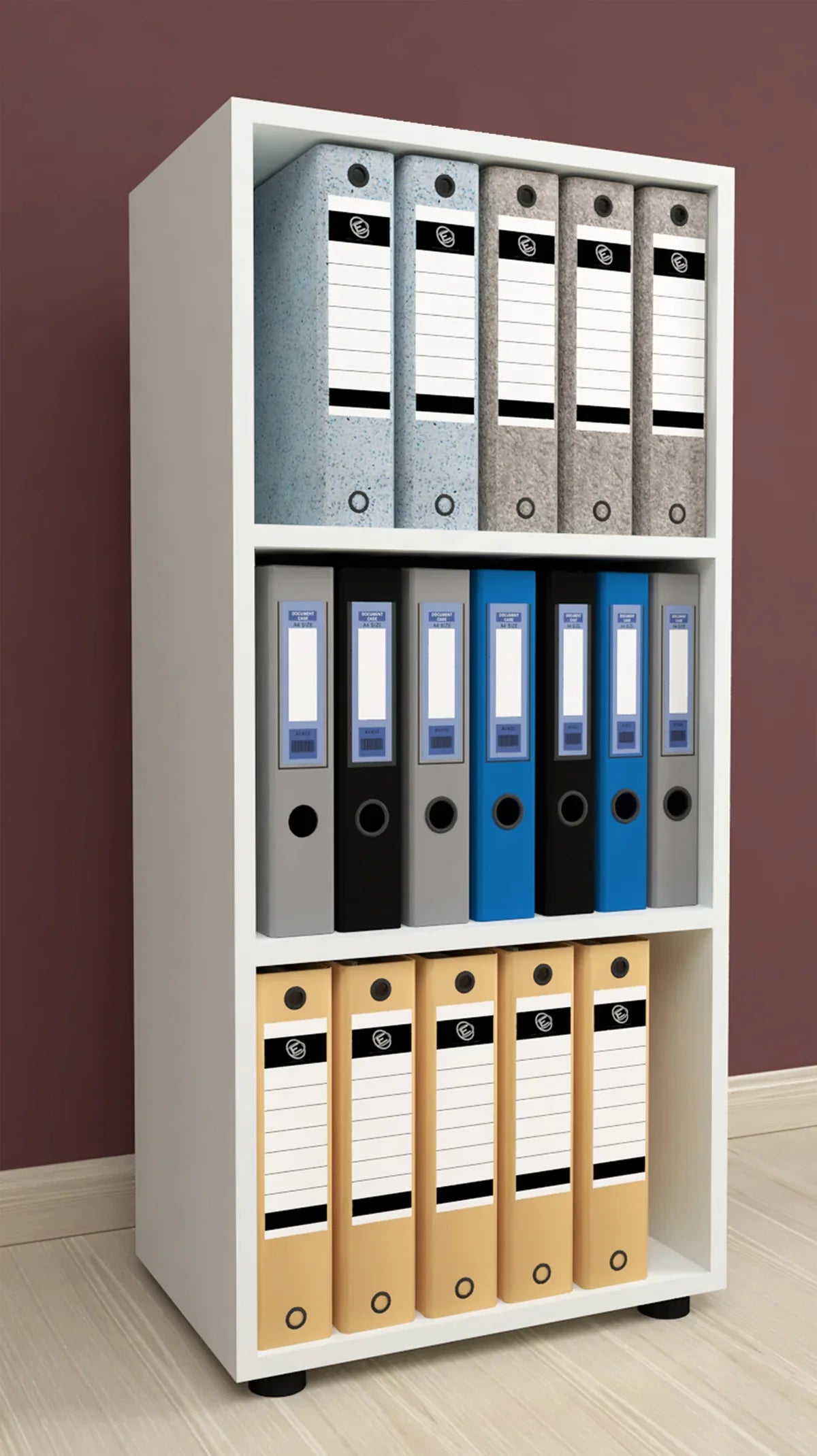 L'étagère « Ulas » comporte trois compartiments, permettant d'accueillir environ 18 dossiers ou autres objets. Son corps est en imitation bois texturé et son panneau arrière est robuste.