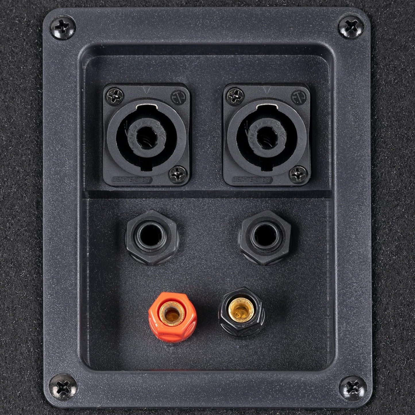 - 1 x entrée compatible Speakon, 1 x sortie compatible Speakon, 2 x entrée jack 6,3 mm, 1 x entrée stéréo à vis plaquée or