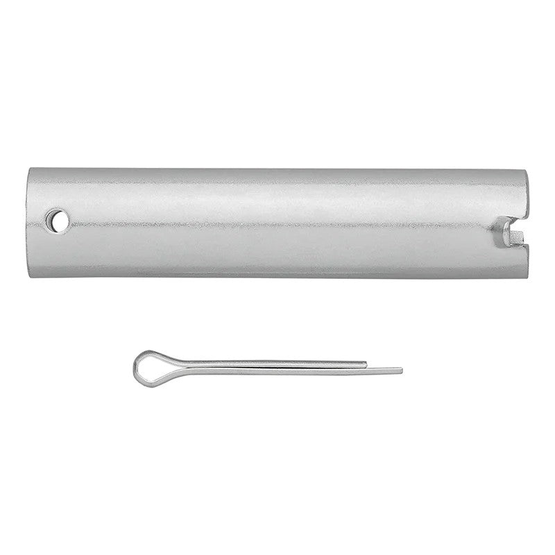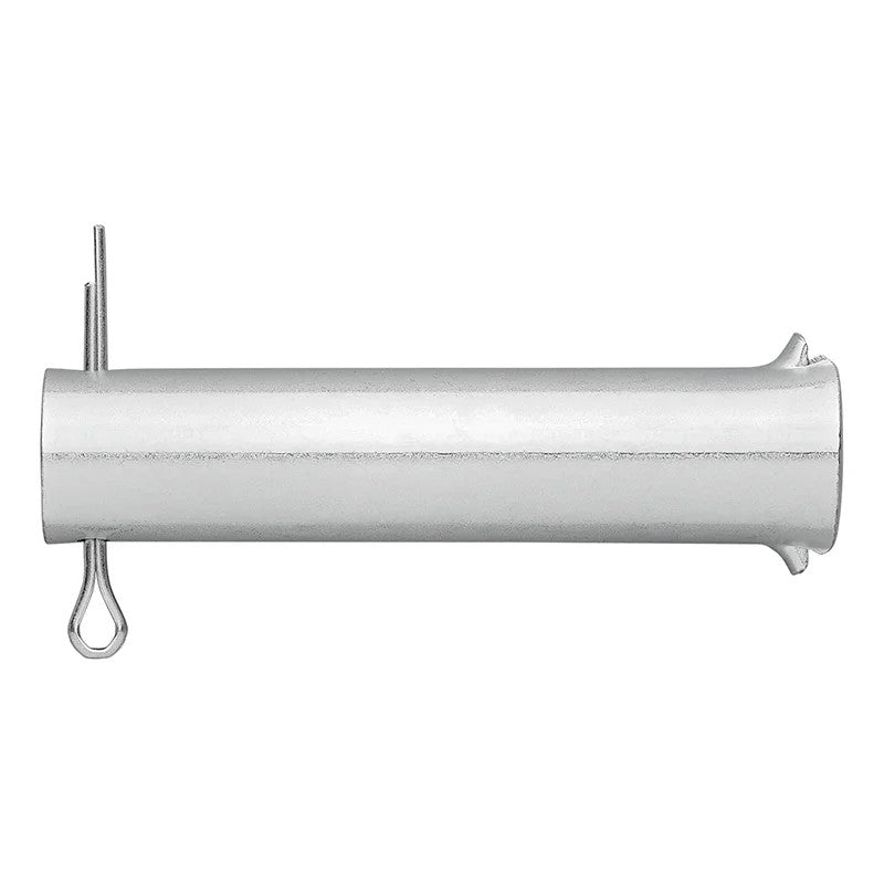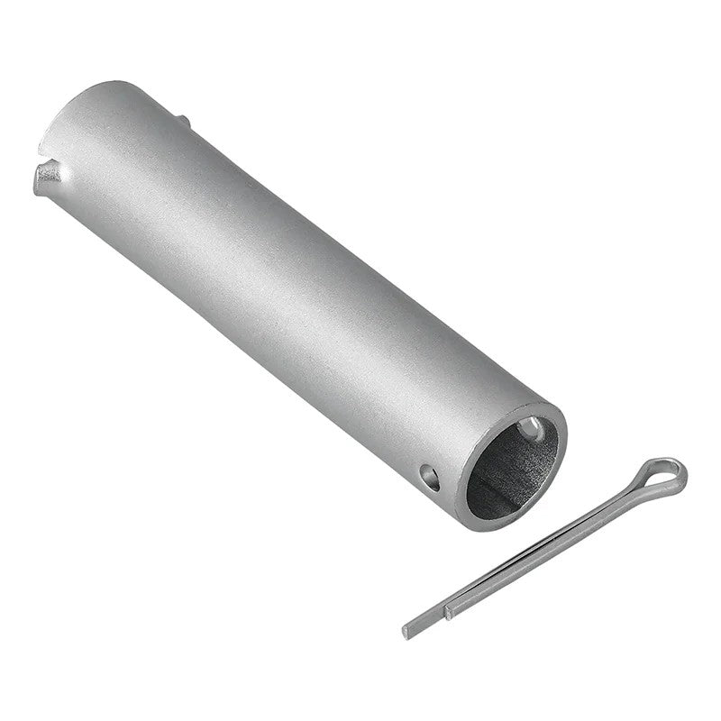 L'axe présente une conception cylindrique avec un pin intégré à une extrémité. Le pin a une longueur d'environ 1,3 cm et un diamètre légèrement inférieur à celui du cylindre. Le corps cylindrique mesure environ 6,4 cm de longueur et possède un intérieur creux avec deux trous de ventilation de grande taille de chaque côté, facilitant probablement le nettoyage et l'évacuation de l'air.
