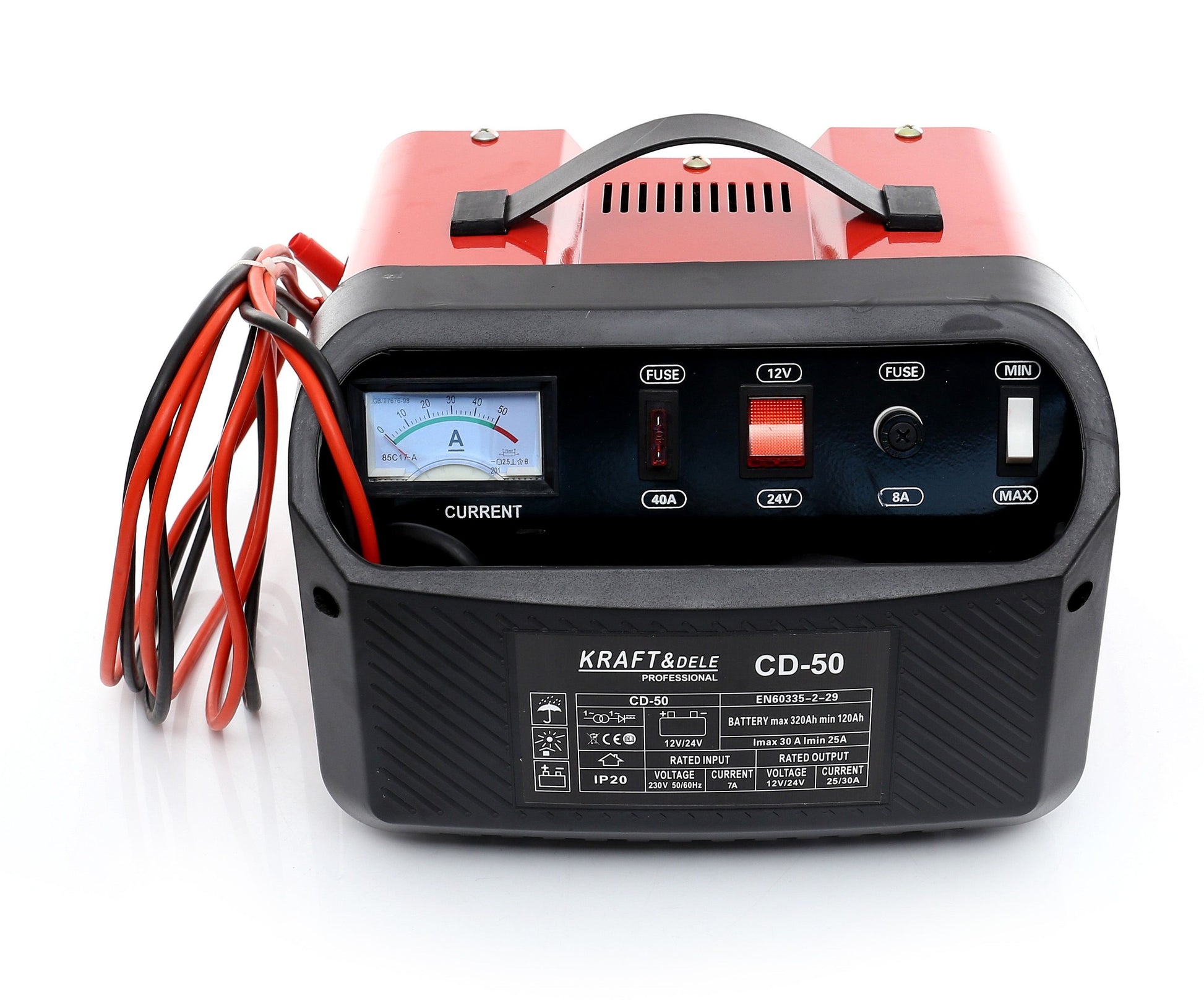 Paramètres : • Alimentation : 230 V 50/60 Hz • Batteries prises en charge : 120 Ah-320 Ah • Tension de charge : 12/24 V • Courant de charge : 50 A • Fusible à plaque : 40 A • Fusible de fusion : 8 A • Équipé d'un ampèremètre • Poids : environ 7 kg |