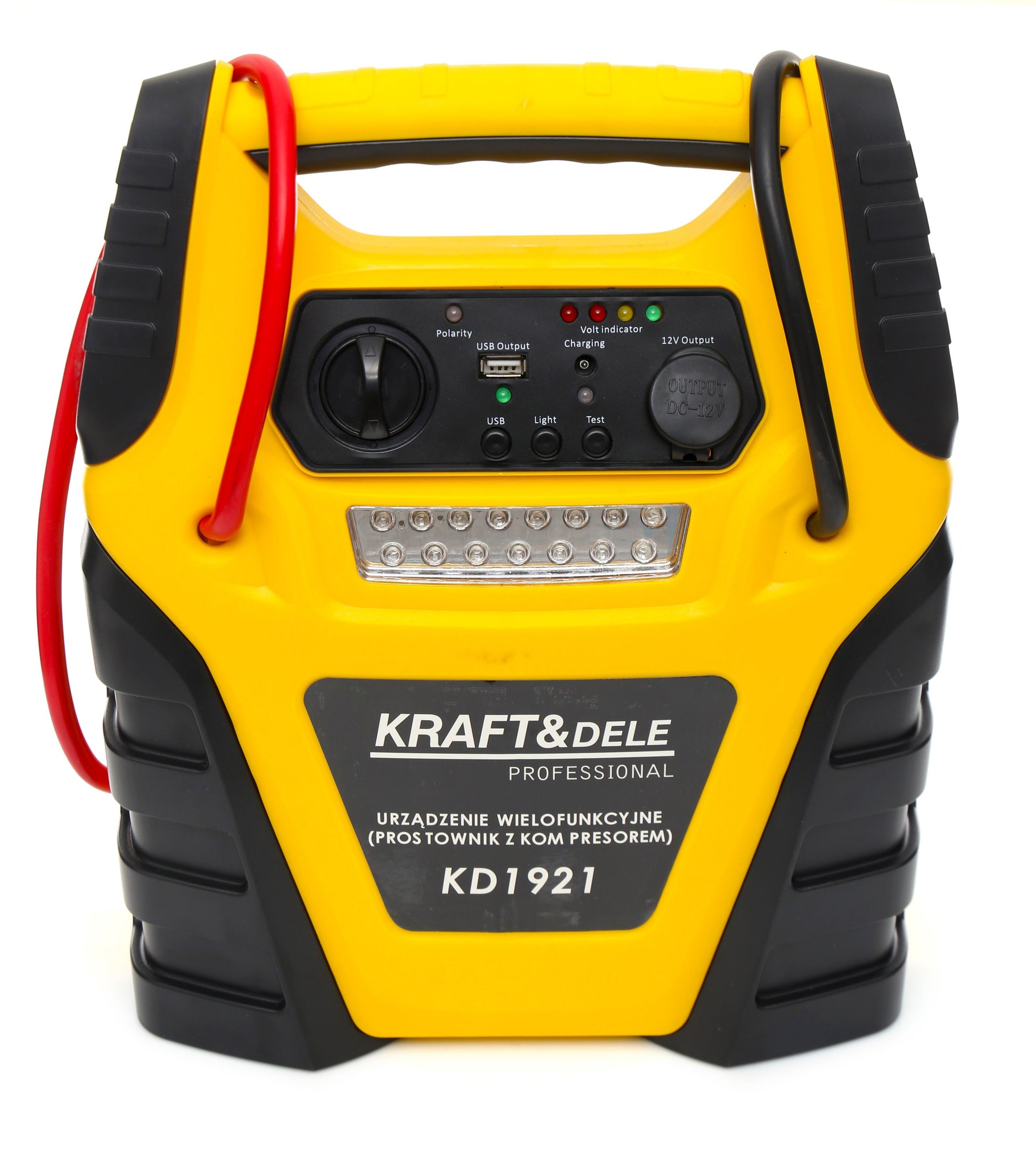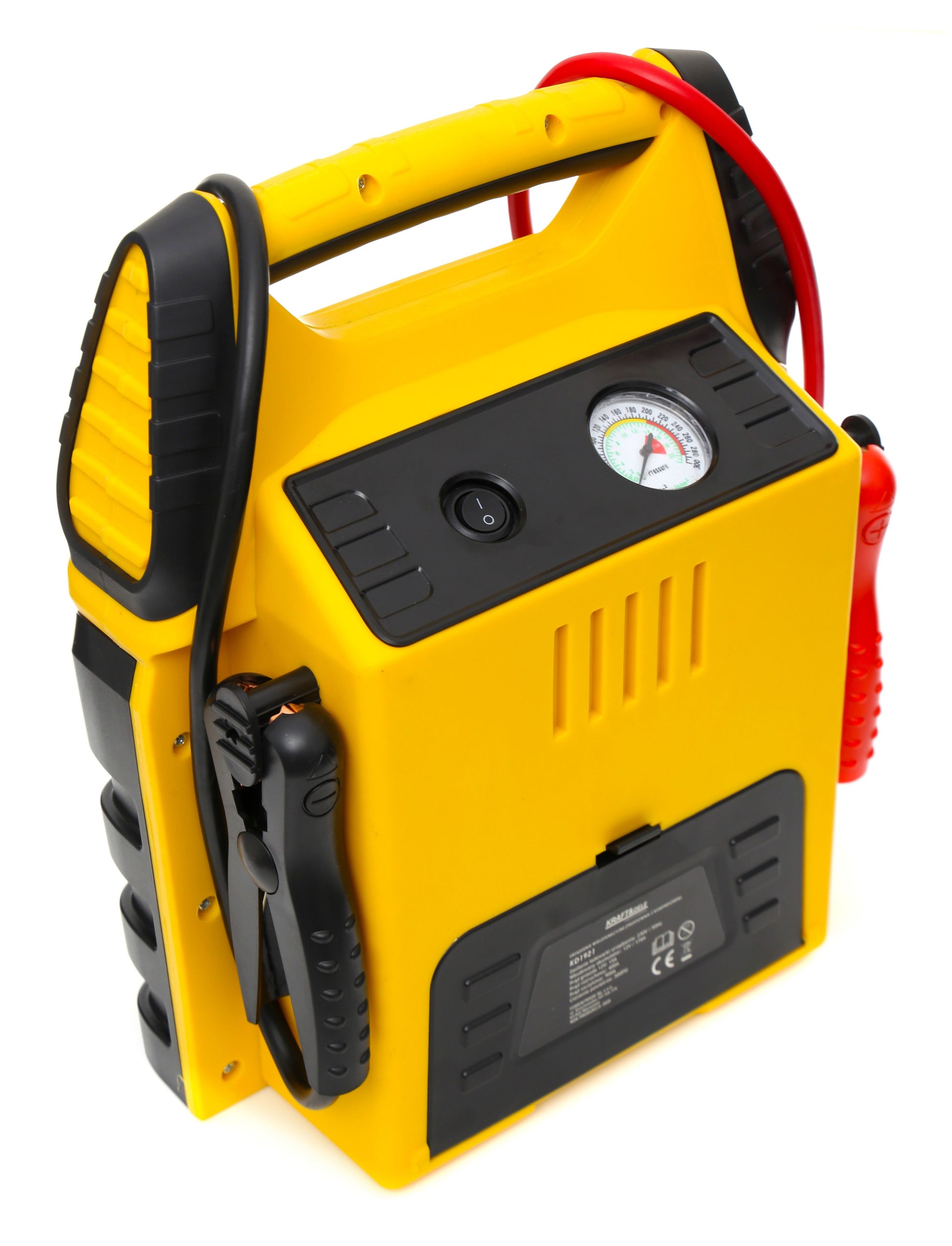 Paramètres : • Batterie intégrée : plomb-acide 12 V/17 Ah • Prises de sortie CC : 12 V + USB 5 V • Courant de démarrage : 400 A • Courant de crête : 900 A • Lampe d'éclairage : 1 x 15 LED • Pression maximale du compresseur : 300 PSI (20 bar) • Protection : Fusible de surcharge • Poids net : 13 kg |