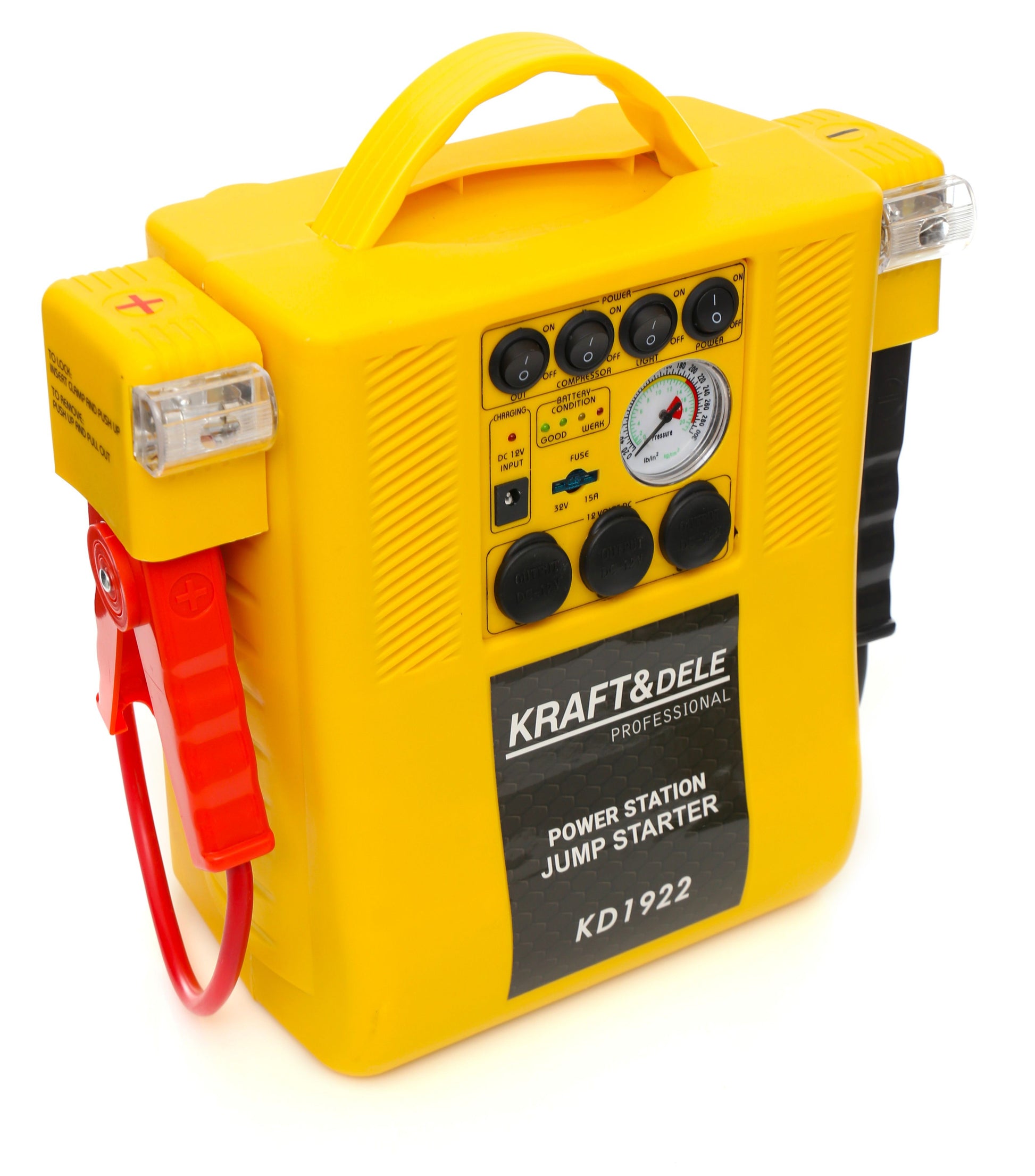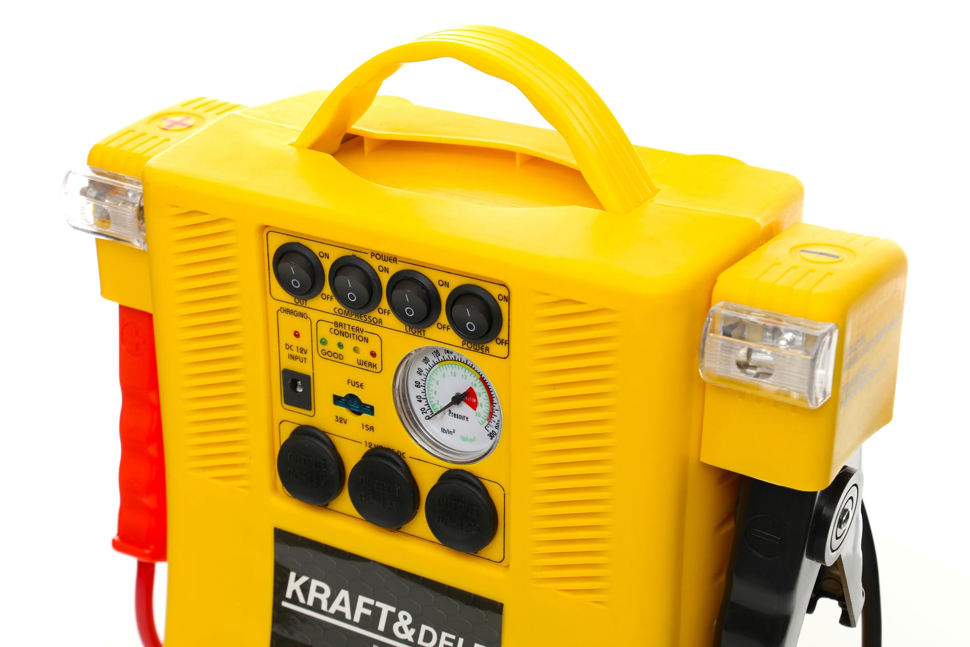 Caractéristiques : • Batterie intégrée : plomb-acide 12 V/17 Ah • Prises de sortie CC : 12 V • Courant de démarrage : 400 A • Courant de crête : 900 A • Ampoules 3 W • Pression maximale du compresseur : 300 PSI (20 bar) • Poids net : 6 kg |