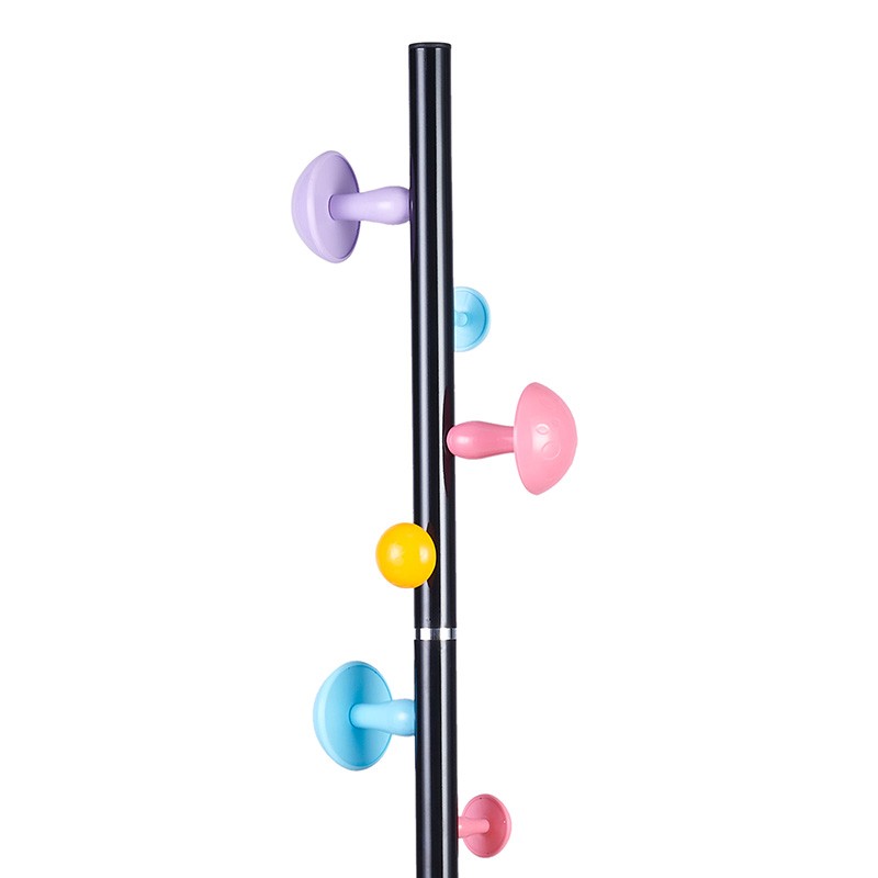 Ce porte-manteau est équipé de six crochets disposés de manière décalée sur le poteau noir, permettant une suspension sécurisée et stable de vos affaires. Chaque crochet est muni d'un point d'attache en plastique circulaire pour garantir une tenue ferme.